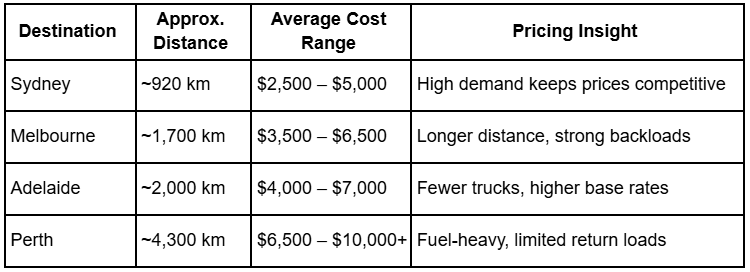 Routes like Brisbane to Sydney and Brisbane to Melbourne tend to offer better pricing flexibility due to frequent truck movement, while long-haul routes such as Perth naturally command higher costs.