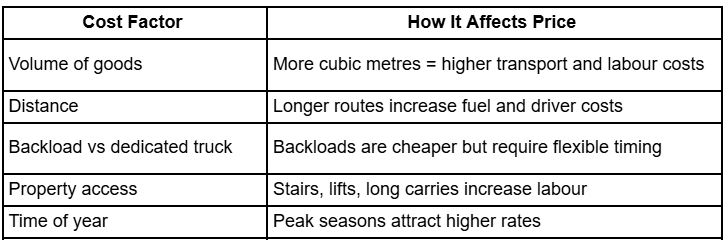 Distance plays a major role, but it’s not the only factor. Truck availability, backload demand, and return routes all influence pricing.