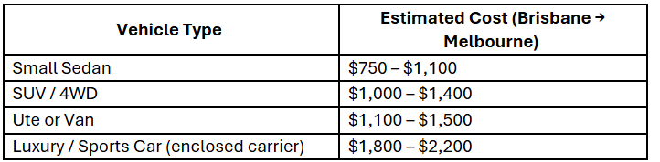 As of 2025, transporting a standard sedan from Brisbane to Melbourne costs between $750 and $1,400 depending on factors like vehicle size, delivery type, and carrier availability. SUVs or 4WDs can cost between $1,000 and $1,800, while luxury or enclosed carrier options can go up to $2,200.